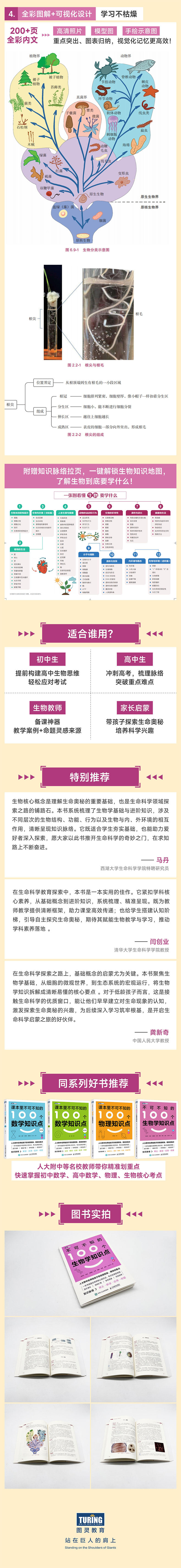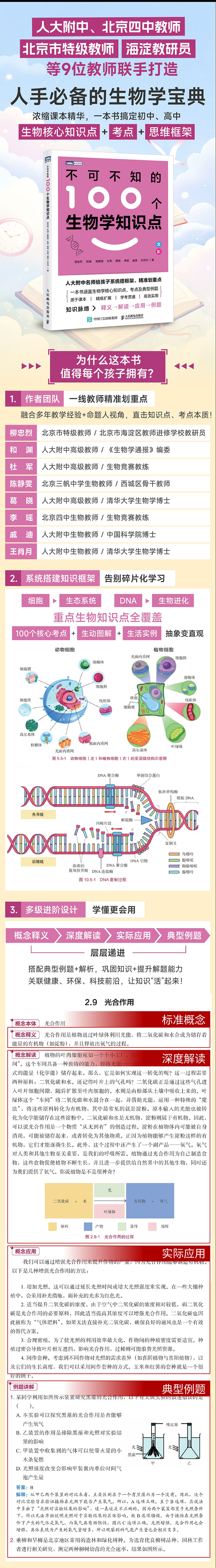 本书的编写团队由中国人民大学附属中学等名校的教师组成,他们凭借丰富的教学经验和对学科知识的深刻理解,精心挑选并详细阐述了生物学中的 100 个核心概念。在概念释义部分和概念解读部分,作者不仅提供了精准的定义,还运用生动的语言和贴近生活的实例,帮助读者更轻松地理解这些概念。概念应用部分则展示了这些概念在现实生活中的具体运用,使读者能够将理论与实践有效结合。最后,通过精心设计的例题,读者可以检验自己对概念的理解程度,并通过实践巩固所学知识。