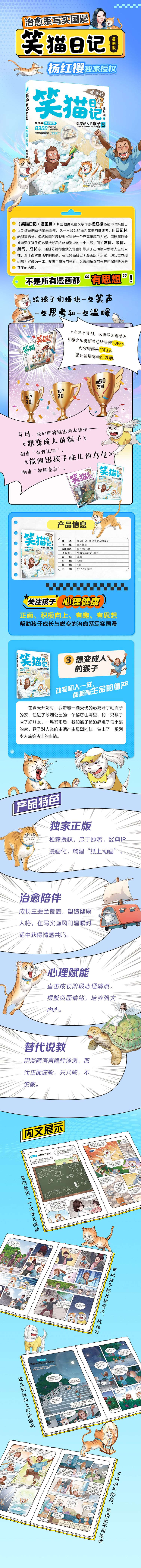《笑猫日记(漫画版)》是根据儿童文学作家杨红樱的畅销书《笑猫日记》改编的系列漫画图书。以一只会笑的猫为故事的讲述者,用日记体的叙事方式、多格漫画的表现形式呈现一个充满童趣的世界。每册都巧妙地蕴涵了孩子们心灵成长和人格塑造中的一个主题,例如友情、亲情、勇气、成长等,通过分镜和幽默的语言引导孩子在阅读中思考人生和人性,勇于面对生活中的挑战。在《笑猫日记(漫画版)》里,现实世界和幻想世界融为一体,充满了奇异的光彩,温暖和乐观的光芒也深深映照进孩子的心里。 第3册为《想变成人的猴子》,有性格、有自尊心的笑猫离家出走了,离开了他最心爱的女孩杜真子,住进了地下朋友老老鼠的“夏宫”。一天,他和老老鼠在翠湖公园发现了这只被虐待的猴子。在马小跳和朋友们的帮助下,猴子被营救了。他隐蔽在“夏宫”,和笑猫做了好朋友。一场暴雨淹没了“夏宫”,马小跳只能把笑猫和猴子接到家里。来到马小跳家,猴子喜欢上了人的生活,一门心思地想变成人,做出了一系列令人啼笑皆非的事情……第4册为《能闻出孩子味儿的乌龟》,一只活了上万年、背上刻着甲骨文的乌龟。他长生不老,是因为他喜欢闻天真纯洁的孩子味儿。在一个大雨如注的夜晚,万年龟驮着笑猫一路闻着孩子味儿来到马小跳的家。在这里,万年龟闻到了更浓的孩子味儿,原来在马小跳家的隔壁,住着他的女同学安琪儿。这是一个像小天使一般可爱的天真纯洁的女孩,可整个暑假,她都被她妈妈关在家里。法力无边的万年龟穿墙而过,他来到安琪儿的身边,他能帮安琪儿过一个快乐的假期吗?