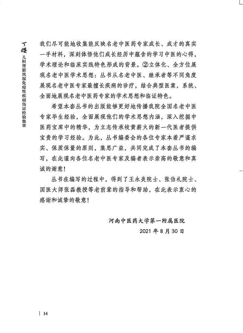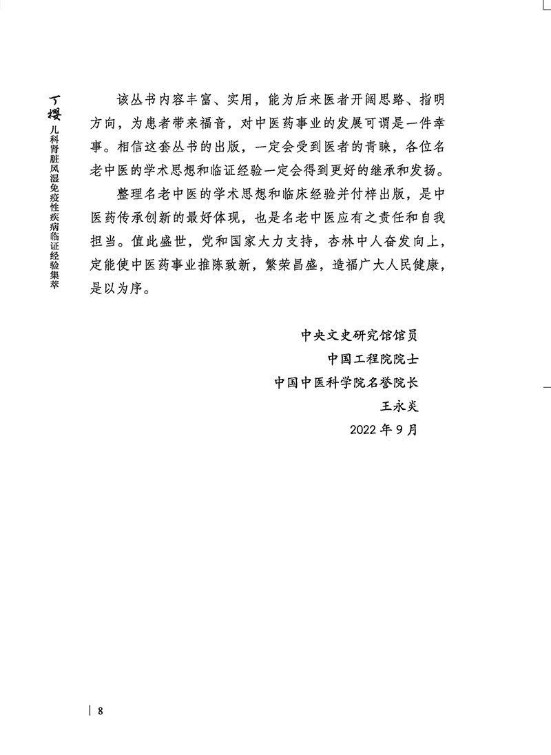 本书介绍了国医大师丁樱教授治疗儿科风湿免疫性疾病的临证经验。全书分为医家传略‘临证精粹、典型医案、跟师笔记四章。丁樱教授从医近五十年,学验俱丰,治学严谨,学贯中西,重视科研与临床结合,成绩斐然。虽已步入古稀之龄,仍勤于临证。专攻儿科肾病,旁涉小儿诸科,临床科研并重,弟子门人众多,所思所悟所研,皆著作付梓,久则几近等身,多得学界认同。遵“为人当益谦,为学应日长”之意,择其要而整理成册。对于临床医生治疗儿科风湿免疫性疾病具有指导意义。