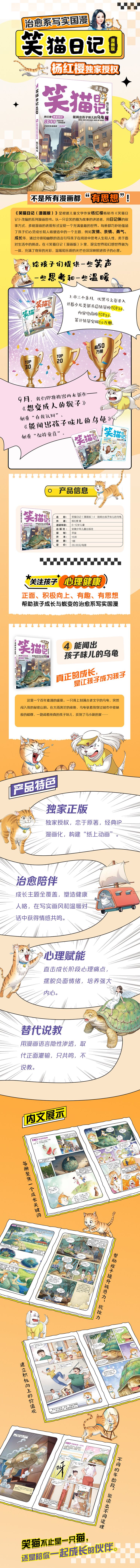 《笑猫日记(漫画版)》是根据儿童文学作家杨红樱的畅销书《笑猫日记》改编的系列漫画图书。以一只会笑的猫为故事的讲述者,用日记体的叙事方式、多格漫画的表现形式呈现一个充满童趣的世界。每册都巧妙地蕴涵了孩子们心灵成长和人格塑造中的一个主题,例如友情、亲情、勇气、成长等,通过分镜和幽默的语言引导孩子在阅读中思考人生和人性,勇于面对生活中的挑战。在《笑猫日记(漫画版)》里,现实世界和幻想世界融为一体,充满了奇异的光彩,温暖和乐观的光芒也深深映照进孩子的心里。 第3册为《想变成人的猴子》,有性格、有自尊心的笑猫离家出走了,离开了他最心爱的女孩杜真子,住进了地下朋友老老鼠的“夏宫”。一天,他和老老鼠在翠湖公园发现了这只被虐待的猴子。在马小跳和朋友们的帮助下,猴子被营救了。他隐蔽在“夏宫”,和笑猫做了好朋友。一场暴雨淹没了“夏宫”,马小跳只能把笑猫和猴子接到家里。来到马小跳家,猴子喜欢上了人的生活,一门心思地想变成人,做出了一系列令人啼笑皆非的事情……第4册为《能闻出孩子味儿的乌龟》,一只活了上万年、背上刻着甲骨文的乌龟。他长生不老,是因为他喜欢闻天真纯洁的孩子味儿。在一个大雨如注的夜晚,万年龟驮着笑猫一路闻着孩子味儿来到马小跳的家。在这里,万年龟闻到了更浓的孩子味儿,原来在马小跳家的隔壁,住着他的女同学安琪儿。这是一个像小天使一般可爱的天真纯洁的女孩,可整个暑假,她都被她妈妈关在家里。法力无边的万年龟穿墙而过,他来到安琪儿的身边,他能帮安琪儿过一个快乐的假期吗?