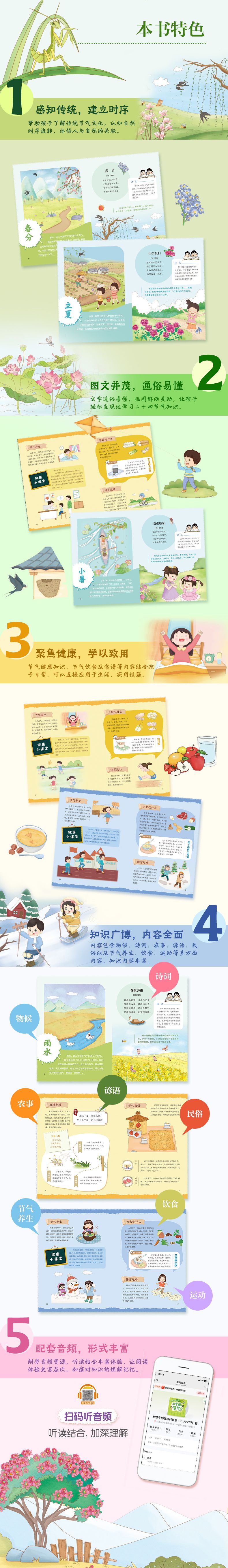 这套书是专门为3—8岁孩子打造的二十四节气健康科普书。按四季分册,系统呈现每个季节6个节气的知识。该书以二十四节气为主线,巧妙融入与每个节气相关的物候变化、经典诗词、农事活动、民间谚语、节气民俗,同时又紧扣健康主题,从节气养生、节气饮食及食谱、体育运动等方面,全方位传递实用的节气健康知识。全书插图精美,文字通俗易懂有趣,让孩子在阅读中领略二十四节气的深厚内涵,掌握相关的文化与健康知识,养成科学生活习惯。