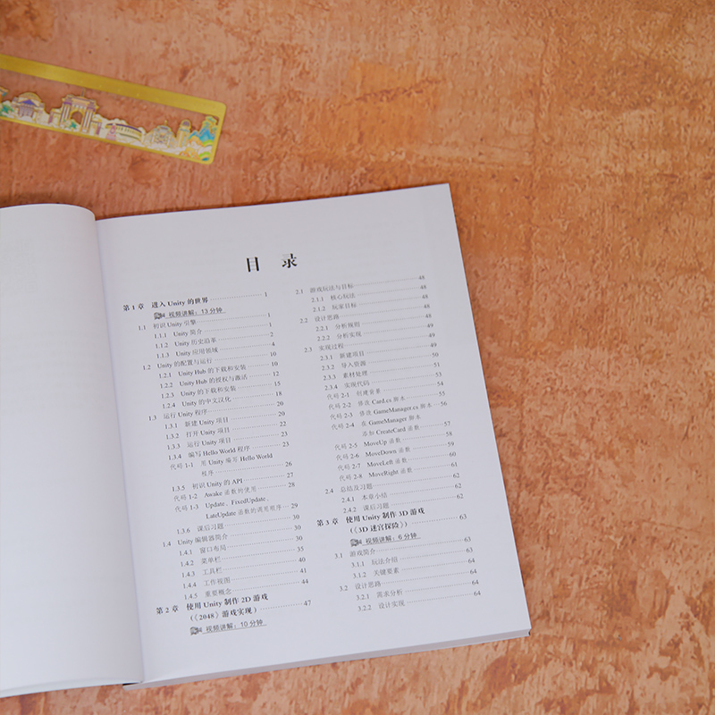 第1章 进入Unity的世界 视频讲解:13分钟 1.1 初识Unity引擎 1.1.1 Unity简介 1.1.2 Unity历史沿革 1.1.3 Unity应用领域 1.2 Unity的配置与运行 1.2.1 Unity Hub的下载和安装 1.2.2 Unity Hub的授权与激活 1.2.3 Unity的下载和安装 1.2.4 Unity的中文汉化 1.3 运行Unity程序 1.3.1 新建Unity项目 1.3.2 打开Unity项目 1.3.3 运行Unity项目 1.3.4 编写Hello World程序 代码1-1 用Unity编写Hello World程序 1.3.5 初识Unity的API 代码1-2 Awake函数的使用 代码1-3 Update、FixedUpdate、LateUpdate函数的调用顺序 1.3.6 课后习题 1.4 Unity编辑器简介 1.4.1 窗口布局 1.4.2 菜单栏 1.4.3 工具栏 1.4.4 工作视图 1.4.5 重要概念第2章 使用Unity制作2D游戏(《2048》游戏实现) 视频讲解:10分钟 2.1 游戏玩法与目标 2.1.1 核心玩法 2.1.2 玩家目标 2.2 设计思路 2.2.1 分析规则 2.2.2 分析实现 2.3 实现过程 2.3.1 新建项目 2.3.2 导入资源 2.3.3 素材处理 2.3.4 实现代码 代码2-1 创建背景 代码2-2 修改Card.cs脚本 代码2-3 修改GameManager.cs脚本 代码2-4 在GameManager脚本添加CreateCard函数 代码2-5 MoveUp函数 代码2-6 MoveDown函数 代码2-7 MoveLeft函数 代码2-8 MoveRight函数 2.4 总结及习题 2.4.1 本章小结 2.4.2 课后习题第3章 使用Unity制作3D游戏(《3D迷宫探险》) 视频讲解:6分钟 3.1 游戏简介 3.1.1 玩法介绍 3.1.2 关键要素 3.2 设计思路 3.2.1 需求分析 3.2.2 设计实现 3.3 实现过程 3.3.1 新建项目 3.3.2 导入资源 3.3.3 搭建场景 3.3.4 设置出入口 3.3.5 添加角色 3.3.6 实现角色移动 代码3-1 实现角色移动 3.3.7 出入口逻辑 代码3-2 出入口逻辑 3.4 总结及习题 3.4.1 本章小结 3.4.2 课后习题第4章 使用Unity实现AR识物(接入SDK) 视频讲解:23分钟 4.1 AR技术 4.1.1 AR简介 4.1.2 AR的特点 4.1.3 AR的应用领域 4.1.4 AR的工作原理 4.2 实现过程 4.2.1 获取EasyAR的Key 4.2.2 下载EasyAR的SDK 4.2.3 新建项目 4.2.4 导入EasyAR的SDK 4.2.5 快速入门 4.2.6 实现AR交互 代码4-1 颜色切换控制脚本实现 4.3 总结及习题 4.3.1 本章小结 4.3.2 课后习题第5章 使用Unity制作VR项目(拆解案例) 视频讲解:20分钟 5.1 VR技术 5.1.1 应用简介 5.1.2 应用方向 5.2 场景搭建制作 5.2.1 新建项目 5.2.2 导入资源 5.3 实现过程 5.3.1 搭建场景 5.3.2 制作飞机尾翼火焰喷射特效 5.3.3 实现飞机飞行 代码5-1 AircraftMove.cs脚本 5.3.4 搭建零件拆解场景 5.3.5 实现飞机零件拆解 代码5-2 实现飞机零件拆解 代码5-3 实现动画移动 5.4 总结及习题 5.4.1 本章小结 5.4.2 课后习题第6章 使用Unity实现答题系统 视频讲解:11分钟 6.1 应用简介 6.1.1 核心组成部分 6.1.2 应用领域 6.2 分析实现 6.2.1 功能分析 6.2.2 实现分析 6.3 实现过程 6.3.1 新建项目 6.3.2 准备题库 6.3.3 搭建UI 6.3.4 读取文档 代码6-1 读取文档 6.3.5 加载题目 代码6-2 加载题目 6.3.6 实现按钮功能 代码6-3 实现按钮功能 6.3.7 判断题目对错 代码6-4 完整的AnswerControl.cs脚本 6.4 总结及习题 6.4.1 本章小结 6.4.2 课后习题第7章 使用Unity实现天气预报系统 视频讲解:26分钟 7.1 应用简介 7.1.1 应用特点 7.1.2 应用功能 7.2 设计思路 7.2.1 功能分析 7.2.2 实现分析 7.3 实现过程 7.3.1 新建项目 7.3.2 搭建UI 7.3.3 获取位置信息 代码7-1 获取位置信息 代码7-2 位置信息解析类 7.3.4 将城市名字转换为城市代码编号 代码7-3 获取城市代码编号 代码7-4 城市代码编号解析类 7.3.5 获取天气信息 代码7-5 获取天气信息 代码7-6 天气信息解析类 代码7-7 整体代码 7.3.6 数据展示 代码7-8 声明变量 代码7-9 将数据显示到UI上 7.4 总结及习题 7.4.1 本章小结 7.4.2 课后习题第8章 使用Unity实现聊天室 视频讲解:15分钟 8.1