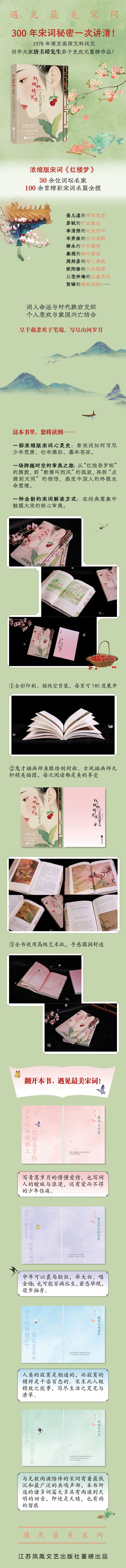 序? 章| 千年听雨,宋词不老 第一章| 繁华与梦想 少年听雨歌楼上? 红烛昏罗帐 写青葱岁月的懵懂爱情,也写词人的暧昧与浪漫,还有爱而不得的少年伤痛。 第一节 少年烦恼那是真烦恼贺?铸·心有锦瑟,奈何无“颜”相赠 晏几道·宋服 101:“心字罗衣”究竟是什么神仙单品?李清照·半生不羁半生忧,自是花中第一秦? 观·秦观的清虚雅词:我们至今仍在用宋词说爱你第二节 诗酒趁年华,好酒洒在歌楼上? 柳? 永·奉旨填词的叛逆者,他改变了宋词格局 ? 晏? 殊·珠玉琳琅词,闲愁最风流:轻奢晏殊词 ? 欧阳修·元夕夜的遗憾美学,欧阳修不忍删除的一首词 第三节 爱的烦恼:繁花落尽是春末? 柳? 永·好到心肝头,俗到骨子里:柳永的江湖夜雨与灯火回望 ? 苏? 轼·当“天涯芳草”遇见少年心气 ? 周邦彦·红楼灯火照归途:解码宋儒的自律精神 ? 李清照·才下眉头,却上兰舟:把思念安放在秋荷深处 第二章| 漂泊岁月的求索 壮年听雨客舟中?江阔云低?断雁叫西风 中年可以裘马轻狂,举大白,唱金缕;也可能百病丛生,窘态毕现,退步抽身。 第一节 山河襟抱,孤勇长歌? 范仲淹·才堪治国,词可清心:孤独的中年儒将 ? 苏? 轼·大江东去与人生放舟:苏轼如何书写赤壁 ? 陆? 游·陆游的秋风恨:心在天山,身老沧州 ? 辛弃疾·将军的热血永不冷却:辛弃疾的词中兵法 第二节 虽是中年,已见残阳? 岳? 飞·战车永远定格在出发时:用鲜血写就的宋词巅峰 ? 辛弃疾·青山白发最高楼:辛弃疾的仕隐三重奏 第三节 天涯“舟漂” ? 南渡词人群·南渡、南渡,惊起一滩鸥鹭 ? 苏?轼·向天再借一壶酒,随风且作逍遥游 ? 朱敦儒·一叶孤舟,半生烟雨:朱敦儒的浮沉人生 ? 辛弃疾·不做大哥很久了:辛弃疾的田园经营与英雄心事 第四节 旷达是中年人痛苦的另类模样? 苏? 轼·假如东坡月下醉舞该是什么模样? ? 张孝祥·把整个宇宙装进一首词里,张孝祥做到了 第三章| 晚年听雨僧庐 而今听雨僧庐下? 鬓已星星也 人类的寂寞是相通的,而寂寞的模样是千姿百态的。宋末词人极精致之能事,写尽生活之荒芜与潦草。 第一节 乱世清音,词心千古 /223 李清照·冷酒与断雁:在江南雨声里收拾破碎的记忆 陆?游·梅花为何被陆游选为“苦情戏主角”? 李煜?宋徽宗·春花易谢,杏花难留:两位帝王词人的家国梦 第二节 归去来兮:禅意人生 /257 ? 苏?轼·东坡禅心:菩提树下得道,洗澡堂里悟禅? 王安石·变法风雨后,禅月照孤心: 钟山骑驴的王荆公是怎样炼成的?第三节 雨打残荷:生命的沉思 /283 ? 姜?夔·南宋最忧伤的黍离之歌——说《扬州慢》? 王沂孙·词人的嗅觉与末代王朝的最后记忆 第四章| 听雨的尽头 悲欢离合总无情? 一任阶前? 点滴到天明 与无数雨滴陪伴的宋词有着最低沉和最广泛的共鸣声部, 本书所选的诸多词篇大多具有雨滴到天明的回音,即使是天晴,也有雨的留痕。 听雨的尽头