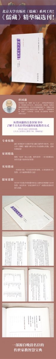 曾国藩【著】【中国】【清】————————————————————曾国藩(1811—1872),原名子城,字伯涵,号涤生,湖南湘乡人。清代杰出的政治家、军事家、理学家和文学家。在学术上,自幼熟读经史子集,好韩愈之文。入仕后,拜军机大臣穆彰阿为师,又从倭仁、唐鉴讲习程朱理学,自称“一宗宋儒”。然处身清末时事激荡内忧外患之局,故提倡经世致用,关注时务,重视民生,整饬吏治,简拔人才,兴办洋务和提倡西学教育,以捍卫封建纲常名教和封建思想统治,成为清末理学思想的代表人物之一。曾国藩作为清廷要员,立足于阐释与践行儒家名教伦理,极力维护摇摇欲坠的政治秩序与伦理秩序。一生著述颇丰,著作最后汇为《曾文正公全集》、《曾国藩未刊信稿》、《曾文正公家训》等。黄长义【校点】【中国】【现当代】————————————————————黄长义,湖北随州人,教授,博士生导师。1999年毕业于武汉大学历史学院,获历史学博士学位。主要研究方向为中国近现代思想与文化、马克思主义中国化大众化、当代文化建设。北京大学《儒藏》编纂与研究中心【编】【中国】【现当代】————————————————————北京大学《儒藏》编纂与研究中心,2004年经教育部批准成立的实体性机构,主要负责国家级重大工程出版规划项目《儒藏》的编纂工作。