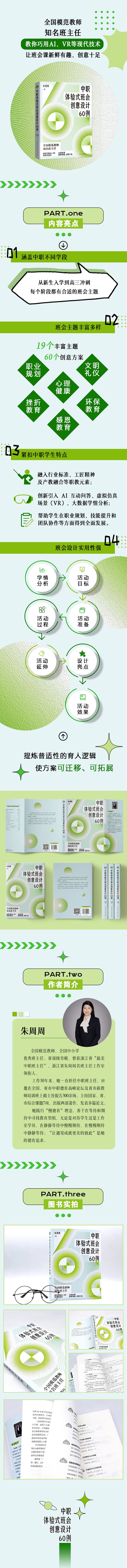 《中职体验式班会创意设计60例》涵盖了从新生入学到高三冲刺的各个学习阶段,主题丰富多样,包括职业规划、心理健康、文明礼仪、挫折教育、感恩教育、环保教育等。 每节班会的方案既紧扣中职学生特点,融入行业标准、工匠精神、产教融合等职教元素,并创新引入AI互动问答、虚拟仿真场景(VR)、大数据学情分析等现代技术,帮助学生在职业规划、技能提升、团队协作等方面得到全面发展,又提炼出普适性的育人逻辑,使方案可迁移、可拓展。