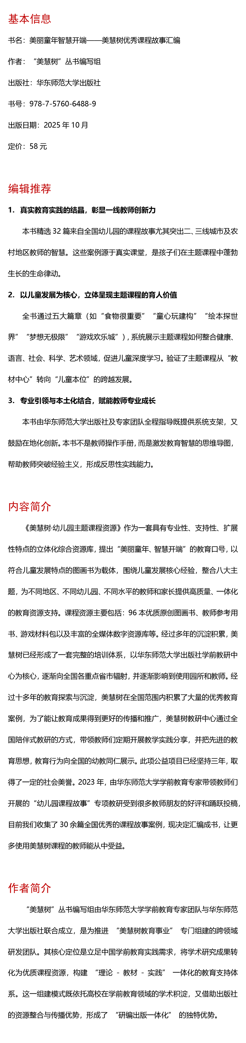 《美慧树·幼儿园主题课程资源》作为一套具有专业性、支持性、扩展性特点的立体化综合资源库,提出“美丽童年、智慧开端”的教育口号,以符合儿童发展特点的图画书为载体,围绕儿童发展核心经验,整合八大主题,为不同地区、不同幼儿园、不同水平的教师和家长提供高质量、一体化的教育资源支持。课程资源主要包括:96本优质原创图画书、教师参考用书、游戏材料包以及丰富的全媒体数字资源库等。经过多年的沉淀积累,美慧树已经形成了一套完整的培训体系,以华东师范大学出版社学前教研中心为核心,逐渐向全国各重点省市辐射,并逐渐影响到使用园所和教师。经过十多年的教育探索与沉淀,美慧树在全国范围内积累了大量的优秀教育案例,为了能让教育成果得到更好的传播和推广,美慧树教研中心通过全国陪伴式教研的方式,带领教师们定期开展教学实践分享,并把先进的教育思想,教育行为向全国的幼教同仁展示。此项公益项目已经坚持三年,取得了一定的社会美誉。2023年,由郑蓓丰园长带领教师们开展的“幼儿园课程故事”专项教研受到很多教师朋友的好评和踊跃投稿,目前我们收集了40余篇全国优秀的课程故事案例,现决定汇编成书,让更多使用美慧树课程的教师能从中受益。
