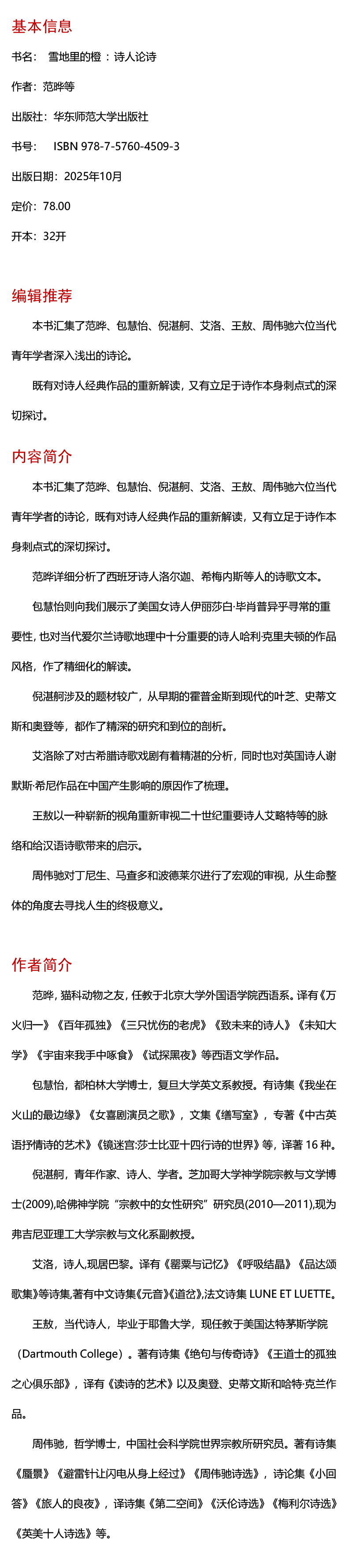 本书汇集了范晔、包慧怡、倪湛舸、艾洛、王敖、周伟驰六位当代活跃的青年学者的诗歌文论,文集辐射美国、英国、西班牙等当代诗歌领域耳熟能详的经典诗人洛尔迦、艾略特等,又囊括相对陌生的实力派迪奥迭维奇等。 既有对诗人经典化的重新解读,又有立足于诗作本身刺点式的深切探讨。六位青年学者,已经在当代诗学领域构成了一道亮丽的风景线,他们以各自的学术功力,在呈现自身诗学个性的同时,形成一个互文共生的联动场域,使得诗文交叉碰撞,生发出诗意的共鸣。