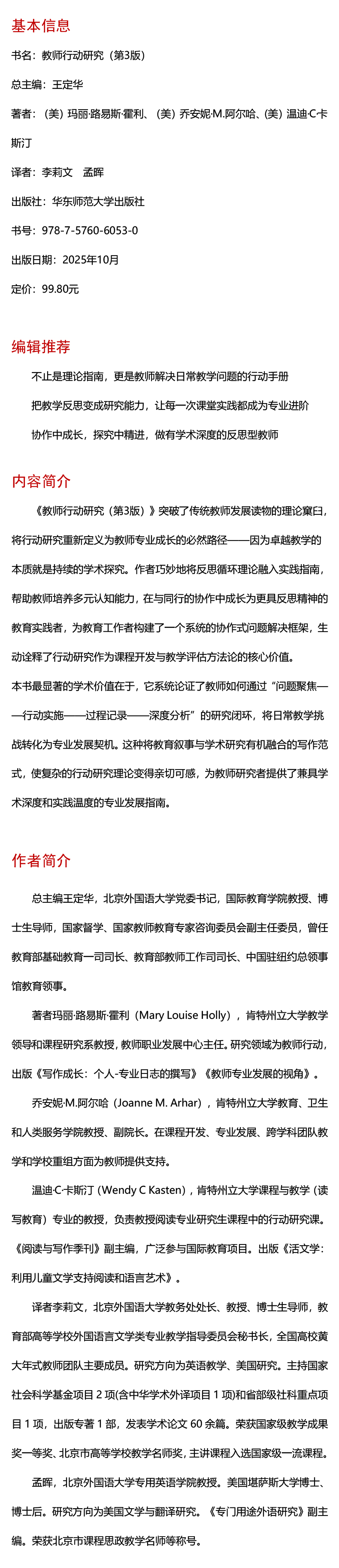 丛书总主编简介:王定华,北京外国语大学党委书记,国际教育学院教授、博士生导师,国家督学、国家教师教育专家咨询委员会副主任委员,曾任教育部基础教育一司司长、教育部教师工作司司长、中国驻纽约总领事馆教育领事。著者简介:玛丽·路易斯·霍利(Mary Louise Holly),肯特州立大学教学领导和课程研究系教授,教师职业发展中心主任。研究领域为教师行动,出版《写作是为了成长》《写作成长:保持个人-专业》《教师职业发展的观点》。乔安妮·M.阿尔哈(Joanne M. Arhar),肯特州立大学教育、卫生和人类服务学院教授、副院长。在课程开发、专业发展、跨学科团队教学和学校重组方面为教师提供支持。温迪·C.卡斯汀(Wendy C. Kasten ),肯特州立大学扫盲课程与教学教授,教授阅读专业研究生课程的行动研究课程,《阅读与写作季刊》副主编,广泛参与国际教育项目。出版《活文学:利用儿童文学支持阅读和语言艺术》。译者简介李莉文,北京外国语大学教务处处长、教授、博士生导师,教育部高等学校外国语言文学类专业教学指导委员会秘书长,全国高校黄大年式教师团队主要成员。研究方向为英语教学、美国研究。主持国家社会科学基金项目2项(含中华学术外译项目1项)和省部级社科重点项目1项,出版专著一部,发表学术论文60余篇。荣获国家级教学成果奖一等奖、北京市高等学校教学名师奖,主讲课程入选国家级一流课程。孟晖,北京外国语大学专用英语学院教授。美国堪萨斯大学博士、博士后。研究方向为美国文学与翻译研究。《专门用途外语研究》副主编。荣获北京市课程思政教学名师等称号。
