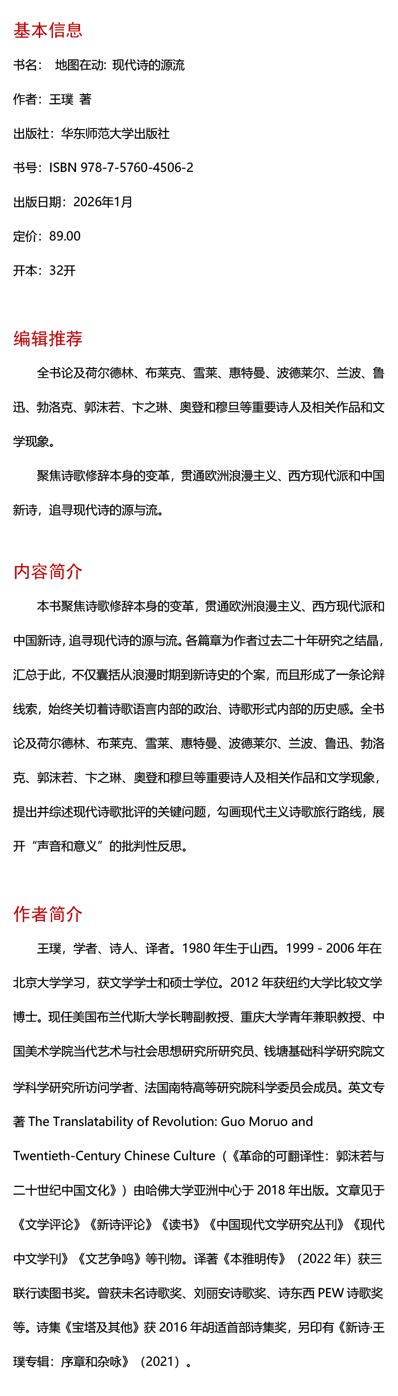 此著作是王璞的诗歌批评合集,聚焦诗歌语言修辞的革命,贯通欧洲浪漫主义、西方现代派和中国新诗,追寻现代诗的源与流。全书穿插讨论荷尔德林、布莱克、雪莱、惠特曼、波德莱尔、兰波、鲁迅、勃洛克、郭沫若、卞之琳、奥登和穆旦等重要诗人及相关作品和文学现象。各篇章为作者过去十余年工作之结晶,汇总于此,不仅展示从浪漫时期到新诗史的个案阐释,而且形成了一条批评踪迹和一个论辩线索。本集先以“序引”提出并综述这一现代诗歌批评的关键问题,随后的篇章从英国浪漫派的“灵视”倾向、德国诗歌的“远游和回溯”修辞,推进到早期鲁迅对“摩罗诗力”之为“源”的言说。相应而来的,还有关于抒情诗“呼语”、现代派“反讽”和散文诗“复沓”的比较研究和理论解读。然后,本书勾画现代主义诗歌旅行路线,出入于汉语内外。紧接着,这本批评集转向白话新诗的格律问题,展开“声音和意义”的批判性反思,经由此,最终又在中国现代主义的难题中回到反讽和抒情这一诗歌张力场。